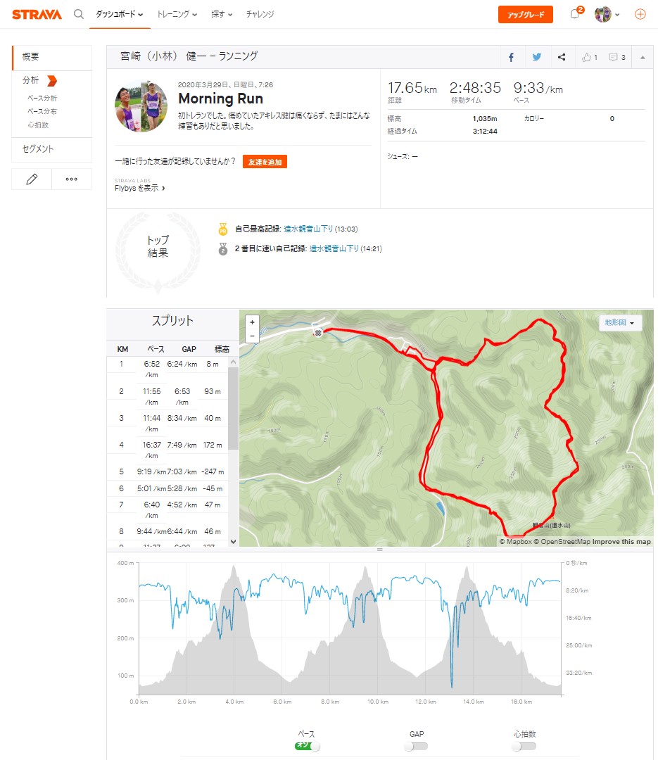 今、木曜日で、まだ日曜日の疲れは取れていないほどの負荷でしたが、いつもロードを走る負荷とは違う負荷で、このトレーニングも効果あるかもしれません。