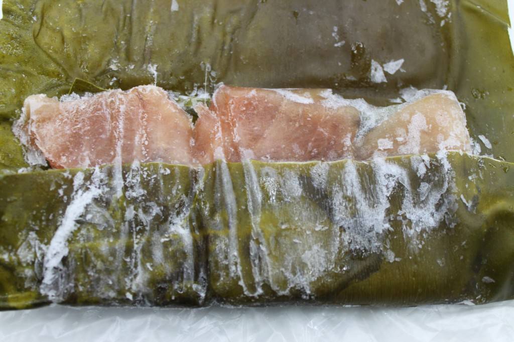 カジキマグロの刺身を昆布に数日巻いて作られます。