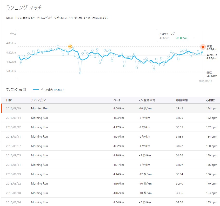 昨日、いつものコースで久々に30分を切るタイムがでました。