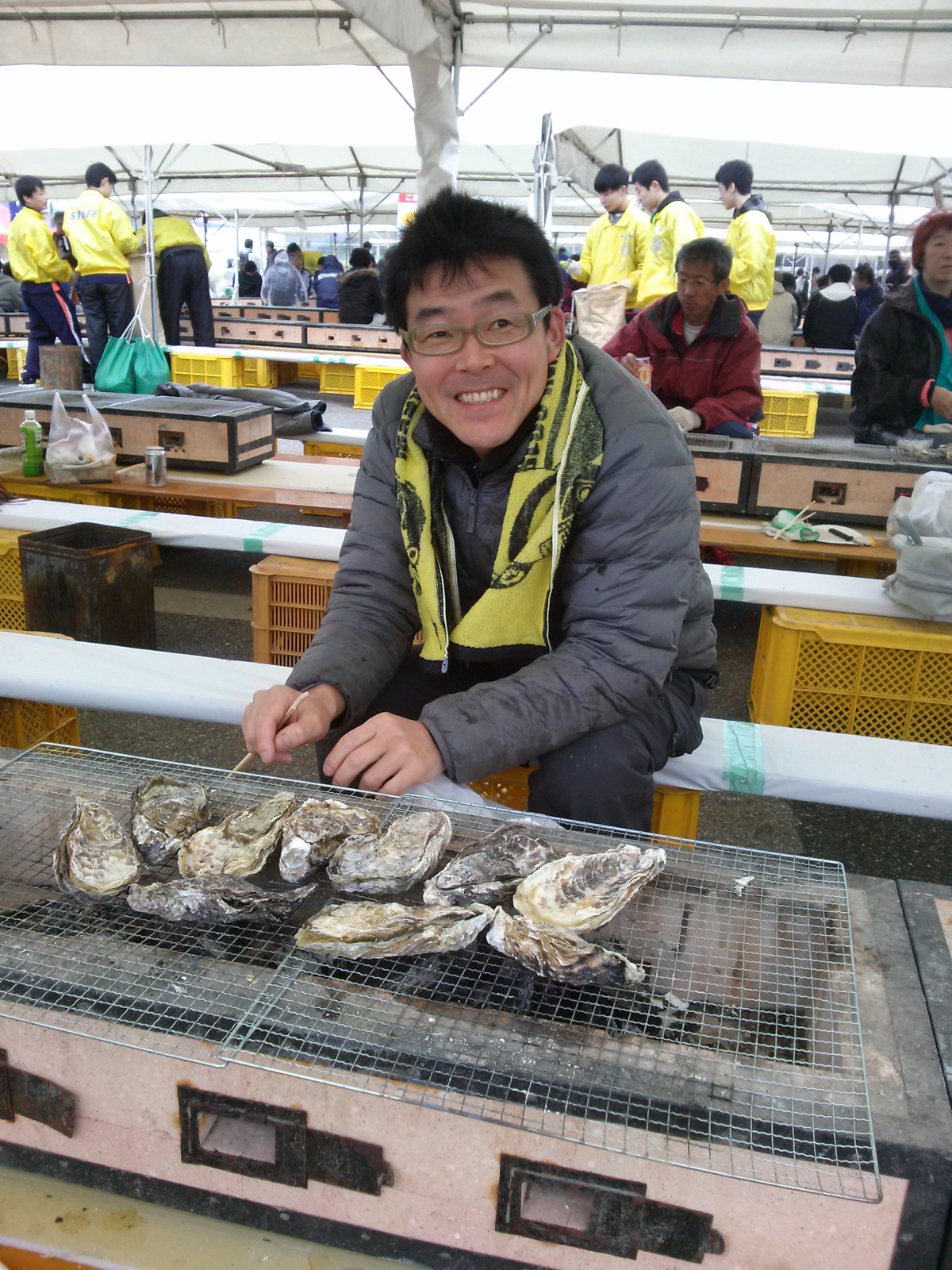 牡蠣を食べているゴール後の写真は、力を出し切り、安心、うれしい表情です。