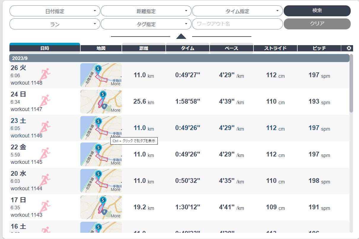 9/26(火) 11㎞ 49:26 ストライド122 ピッチ197