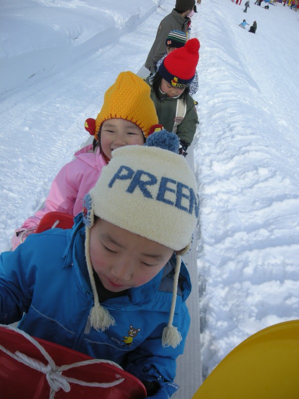 となりのゲレンデのこの日はすごく良い雪質を目にしながら、ひたすらソリ遊びで、