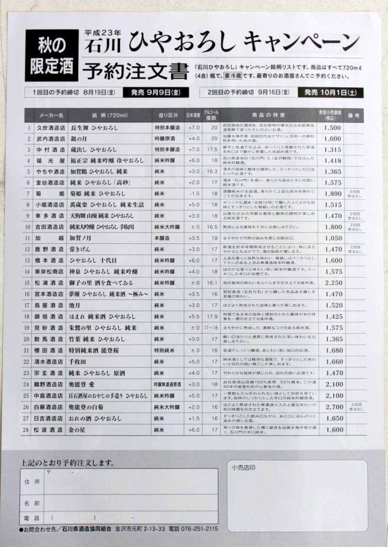 2011年ひやおろし 案内です 未選択 2011年06月29日 8月19日までに予約を受け、9月9日に発売する毎年恒例の企画で、今年は28蔵が参加します。飲みたいものがある方はどしどしご予約お願いします。毎年毎年やっていますから、人気のあるものははっきり言ってわかっています。天狗舞、手取川、常きげん に他なりません。今年は、今まで参加していなかった、菊姫さんもついに参加します。当店としては、これらの人気の品を踏まえながら、他にもいろいろおすすめしたいんですが、中でも、24番 鶴野酒造店 奥能登 愛 2100円13番 橋本酒造 ひやおろし 十代目 1600円がおすすめです。24番 は2100円と高級ですが、飲んだ人は飲んだ瞬間にきっと喜んでもらえます。25番のひやおろしではない、生酒を数日前に晩酌しましたが、『一度飲んだら忘れられない味』とコメントにあるように、そんな味です。このお酒も2100円で、少し飲んだだけでは、2100円の価値がないように正直思って飲んでいましたが、だんだん味がでてきます。 [0回]