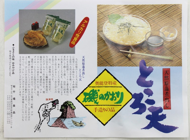 干場のところてん 未選択 2011年03月24日 干場のところてん(ほしばのところてん) という、能登のところてんが あるのですが、石川県の中では、最高峰の部類に入る、高級ところてんです。当店でも2年前から取り扱っていて、先日仕入れたものの中に、パンフレットが一枚紛れ込んでいたので、捨てるのももったいなく、こうして、画像をアップしています。干場のところてんhttp://www.saka-gura.com/208_1110.html今日なんかは、まだ雪が降っていて、ところてん の気分ではありませんが、まあ、気にしないでおきましょう。この商品を作っているところは、酒蔵では、「宗玄」さんの近くですね。何かのついでがあったら、覚えておきたい、アイテムです。僕は、この商品は好きです。多くは売れませんが、これまでに、数人のお客さんから注文を頂く商品ですし、購入されるかたは、数個と言う単位ではなく、ドバッと購入されます。 [0回]