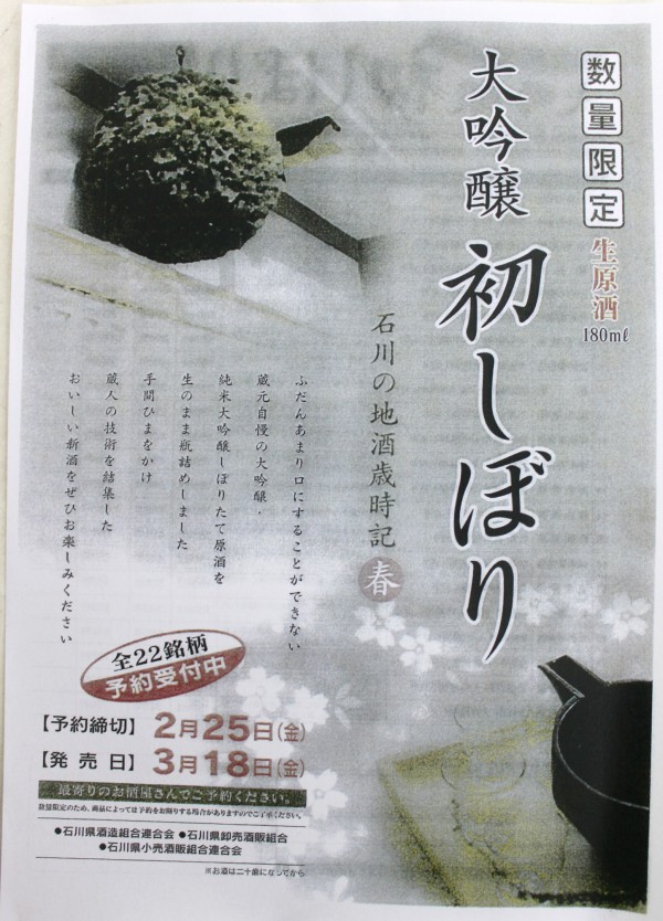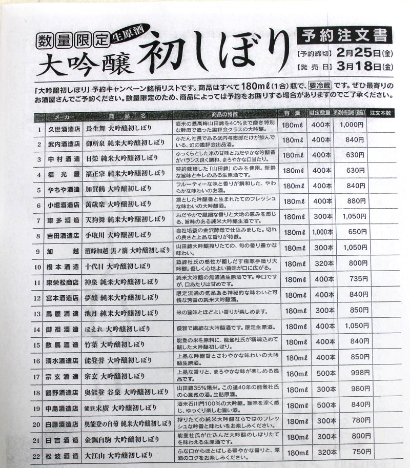 石川県22蔵の 大吟醸180ml お試し企画 未選択 2011年01月26日 石川県の酒造連合会が「石川ひやおろし」企画の次に企画している企画を本日聞きました。「大吟醸初しぼり」予約キャンペーン とでも言いましょうか?2月25日までに予約をして、3月18日が発売日です。蔵元さんごとに、価格はバラバラで、スペックも違います。普段あまり口にする事ができない大吟醸・純米大吟醸を飲んでもらうおうと、連合会で考え、こういう企画が実現しました。さて、どうなるでしょうか?荒い画像のパンフレットですいません。興味のある方は、クリックして、よ~く見てみてください。個人的に気になったのは2 武内酒造店さんのコメント「ふだん社長である武内与志朗だけが飲んでいる、幻の鑑評会出品酒」 ↑面白いコメントです、180ml840円ですし、うちでも扱っている、武内酒造店さんのお酒ですから、当然オススメです。8 吉田酒造店さんの 価格 「650円」価格の意味でオススメです。もちろん、味もオススメです。11 神泉 さんの価格「735円」価格の事はおいておくと、すでに180mlで630円を越える異常ともいえる価格ですから、欲しい人にとっては、630円も1050円も大した違いはないでしょう。それぞれのお好きな蔵の大吟醸を飲んでも良いのかも知れません。ちなみに、自分は 谷泉 と 御所泉 と 十代目 が飲んでみたいかな?と思います。 [0回]