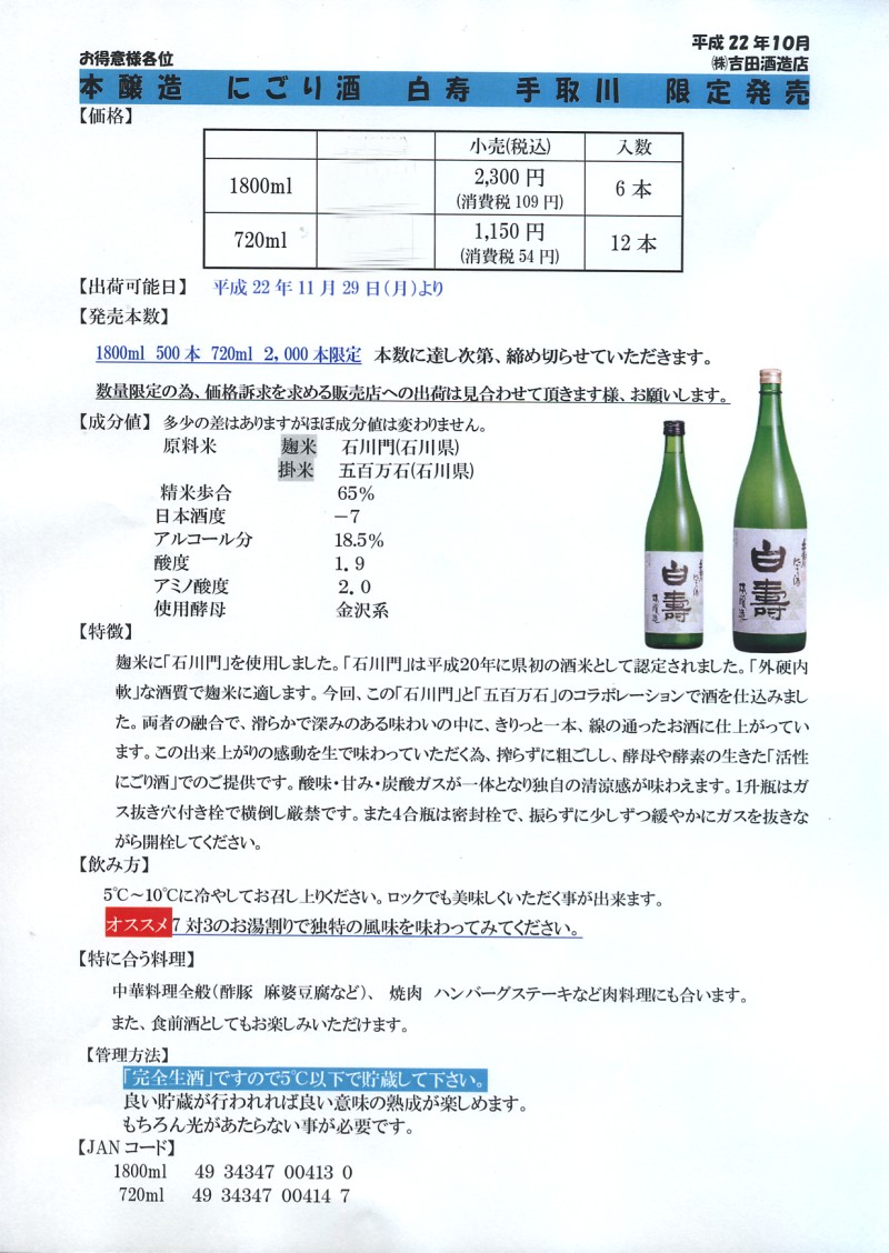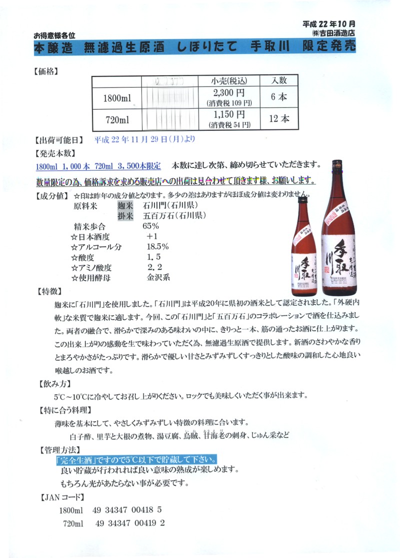 本醸造 無濾過生原酒 しぼりたて 手取川