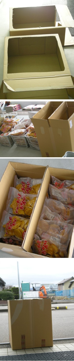 こわれせんべい 60袋 未選択 2010年03月02日 こわれせんべい 60袋の注文が時々ありますので、その様子を紹介します。箱を切り穴をあけて、2つの箱をガムテープで連結します。2つの箱を切ったのは、真ん中の部分を切ることによってより多くのせんべいが入るからです。今回は、できるだけ、重さのあるものを選んで入れて欲しいというご要望があったので、こうする必要があったのでした。今回判明したのですが、60袋と言う上限でしたが、70袋は入ります。ですので、70袋まで送れるようになりました。真ん中を切らなければ60袋m真ん中を切ると70袋なんです。いつ入荷するか?分かりませんが、「丸武小泉商店」さんのせんべいも 数日前に発注しておきました。最近せんべいが品薄気味でしたから… [0回]