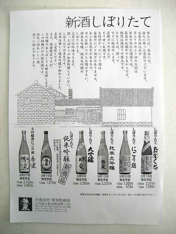 当店より、車で8分、手取川を挟みますが、地元の蔵元「神泉」さん。