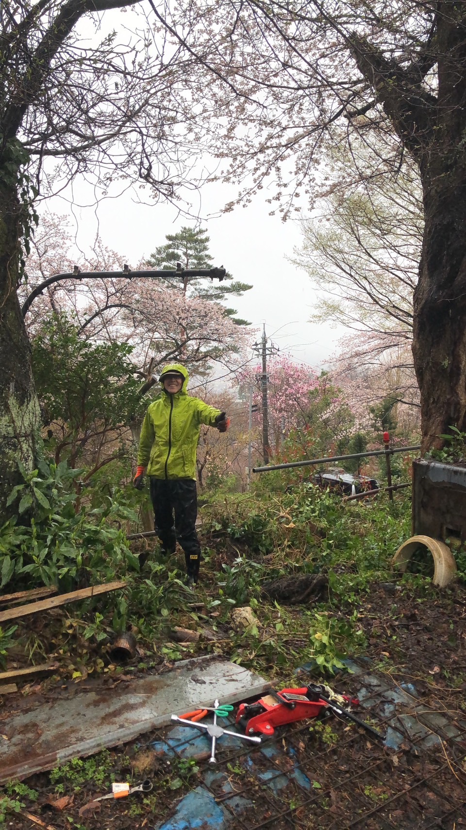小雨の中、ランニング用に買った合羽で、作業。こんなことするために買った合羽じゃない。