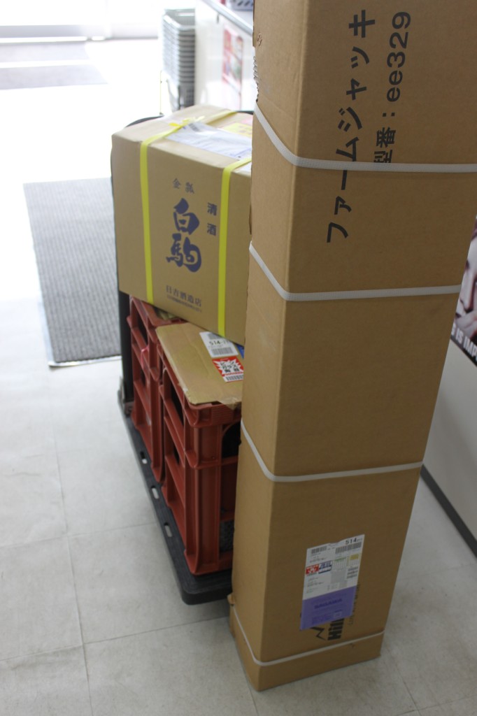 ジャッキもお酒と同じトラックで入荷。ジャッキが間に合ってよかった。箱を開けないと分からないですが、大きいのはたぶん箱だけ