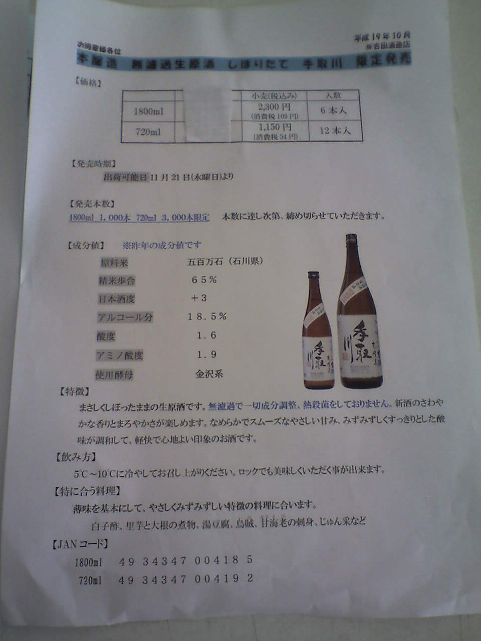 手取川より、季節商品のご案内、クリックすると大きくなります 未選択 2007年11月09日 ちょっと今回は手抜きです。手取川より、「しぼりたて生原酒」と「にごり酒」が発売されます。どちらも11/21発売です。どちらも720mlをほんの数本ずつ発注しておきました。 [0回]