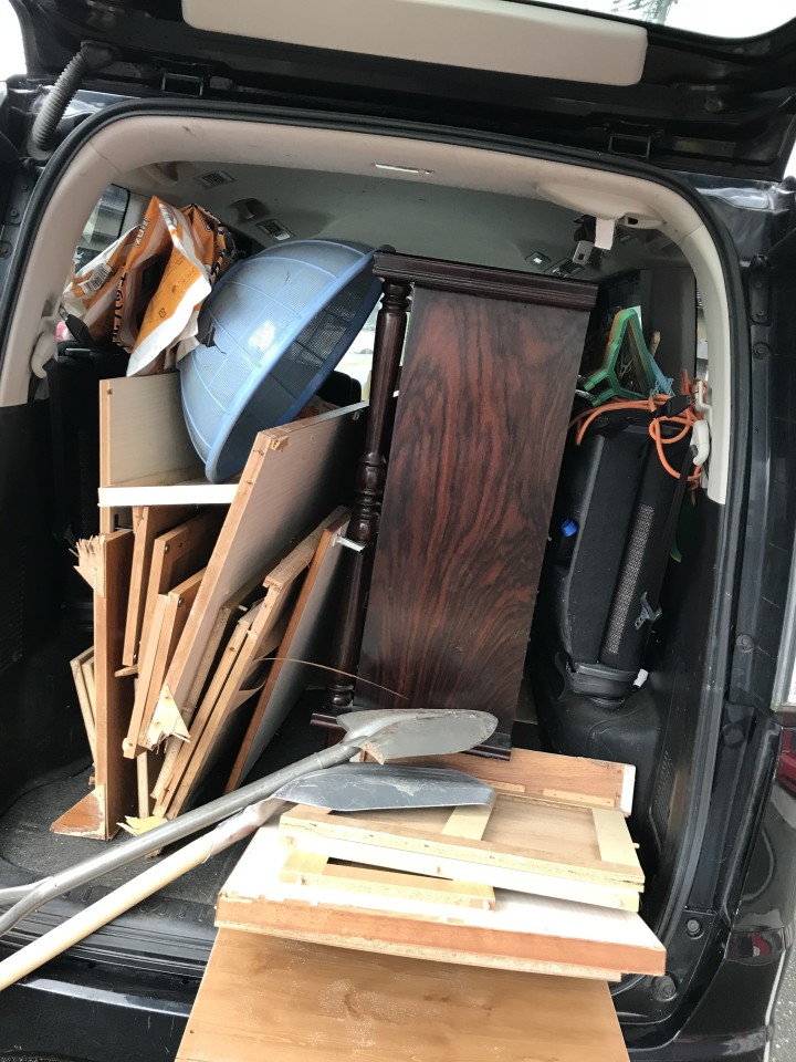 車に3個分の棚を載せた。キックで壊して小さくした。壊す準備をしていなかったが、キックは強い。大きな棚が残り6個ほど。まだまだ片付かない。あと3回くらいか?