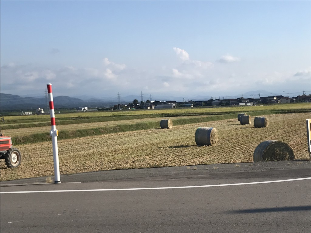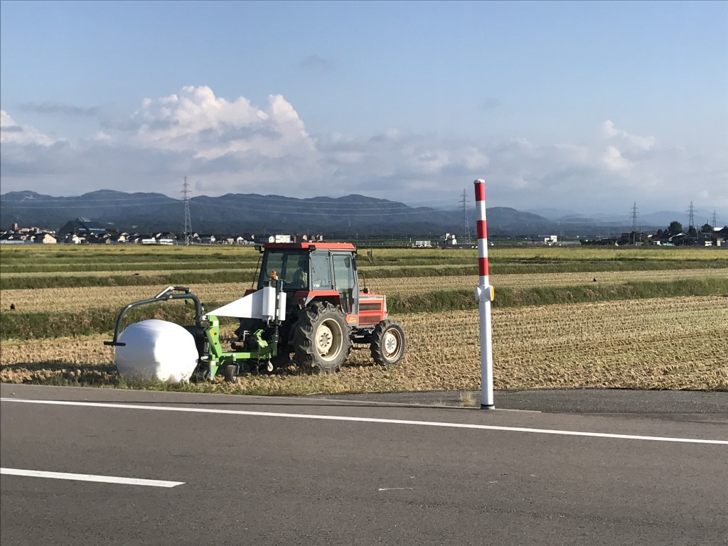 左の写真の、わらの塊がありますが、右の写真のように、機械で白いテープで巻くんですが、今回初めて巻いているところを見ました。