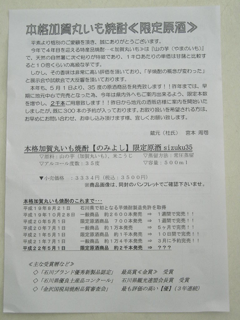 毎年早期完売が続いている、本格加賀丸いも焼酎【のみよし】幻の原酒