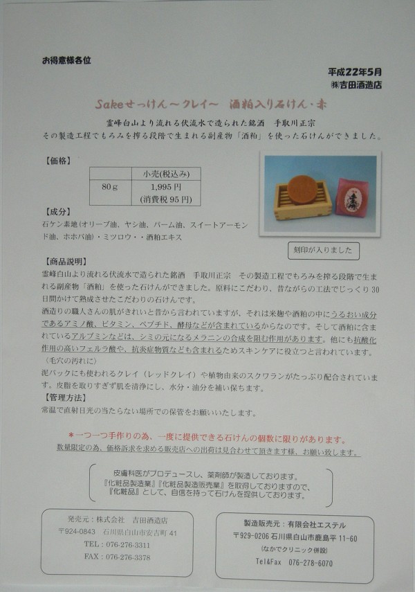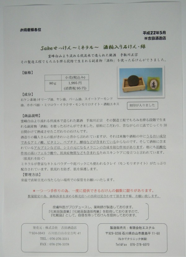 手取川 の吉田酒造店さんでは、今回、あらたに2種類のせっけんを発売しましたが、
