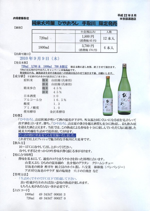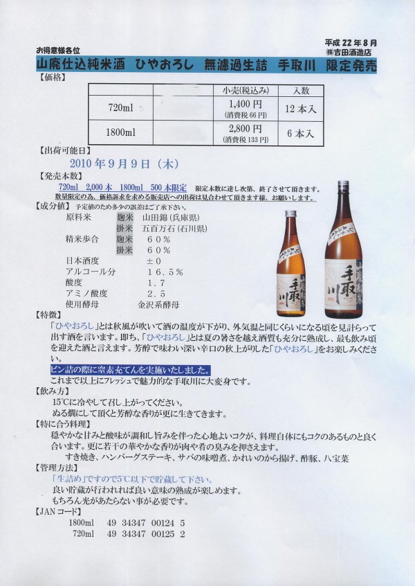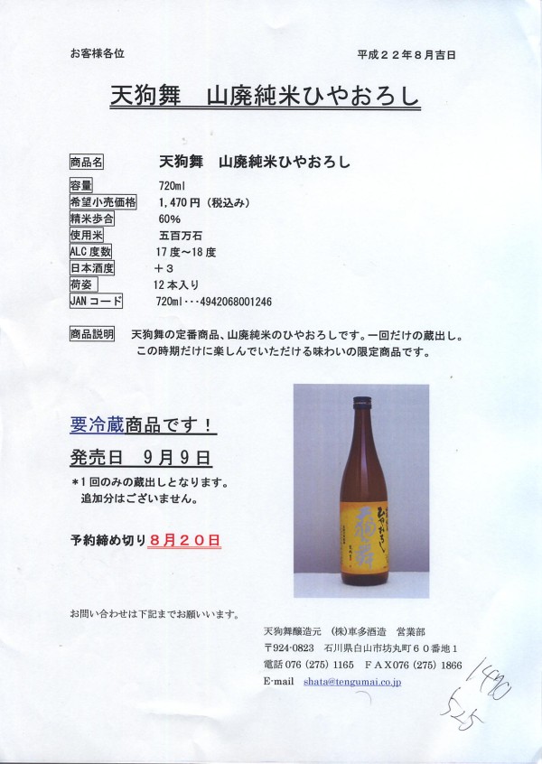 手取川、天狗舞 のひやおろしの案内