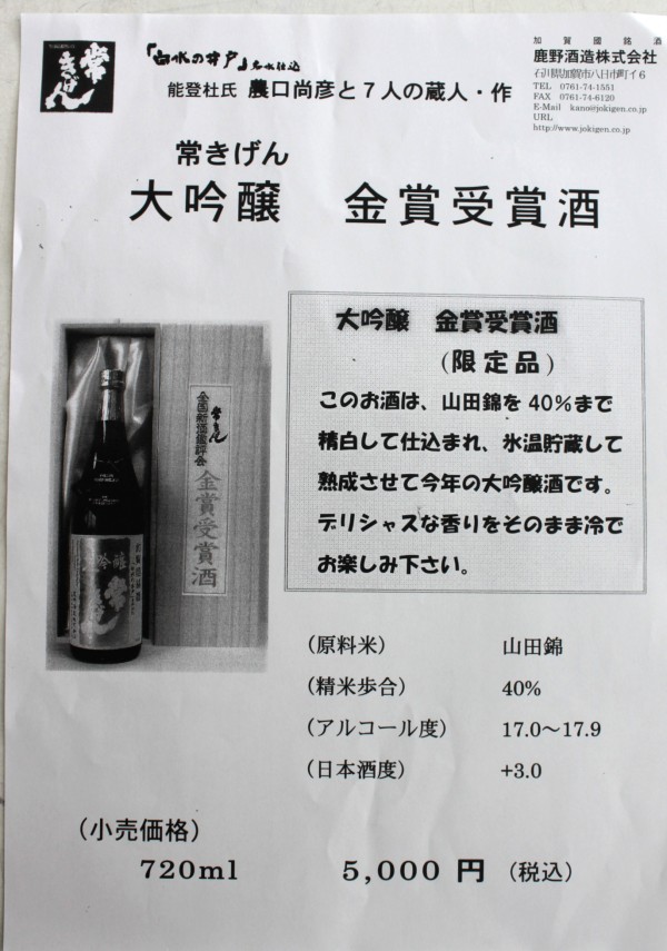 奥能登の白菊、谷泉と天狗舞、手取川、菊姫などを販売しています。