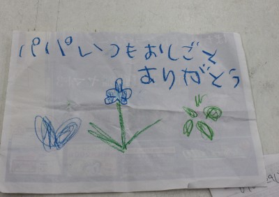 娘からもらった 未選択 2011年10月08日 娘から、突然もらいました。娘は5歳で、息子は6歳ですが、息子はまだ字を書く意志がなく、字は書きません。でも読むことはできます。娘は息子ほど多くは読めませんが、書くことができます。たぶん、二人は競っています。娘は絵がすきなようで、妻に似てるのか?と思います。私は、絵も歌も、その他、なにもかも苦手ですから。 [1回]PR
