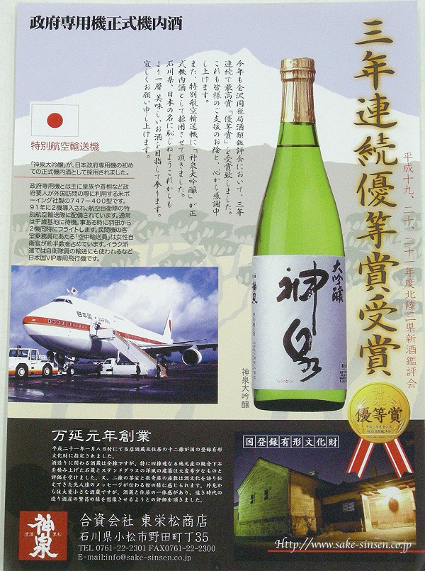 「三年連続金沢国税局新酒鑑評会金賞受賞」のパンフレットです。