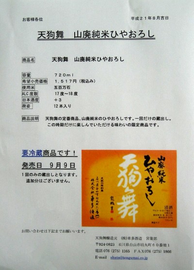 今年も9/9に発売される、天狗舞 山廃純米ひやおろし の資料を持ってきました。