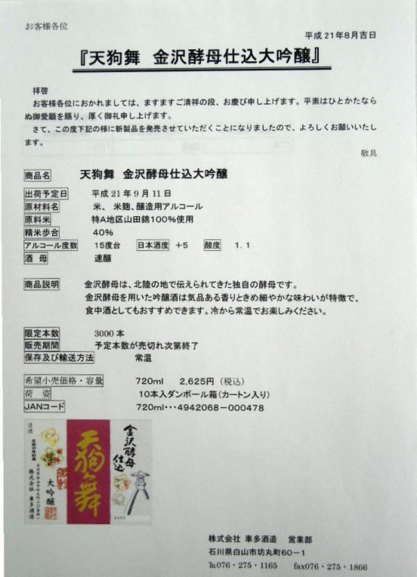 天狗舞 金沢酵母仕込大吟醸 【新発売】